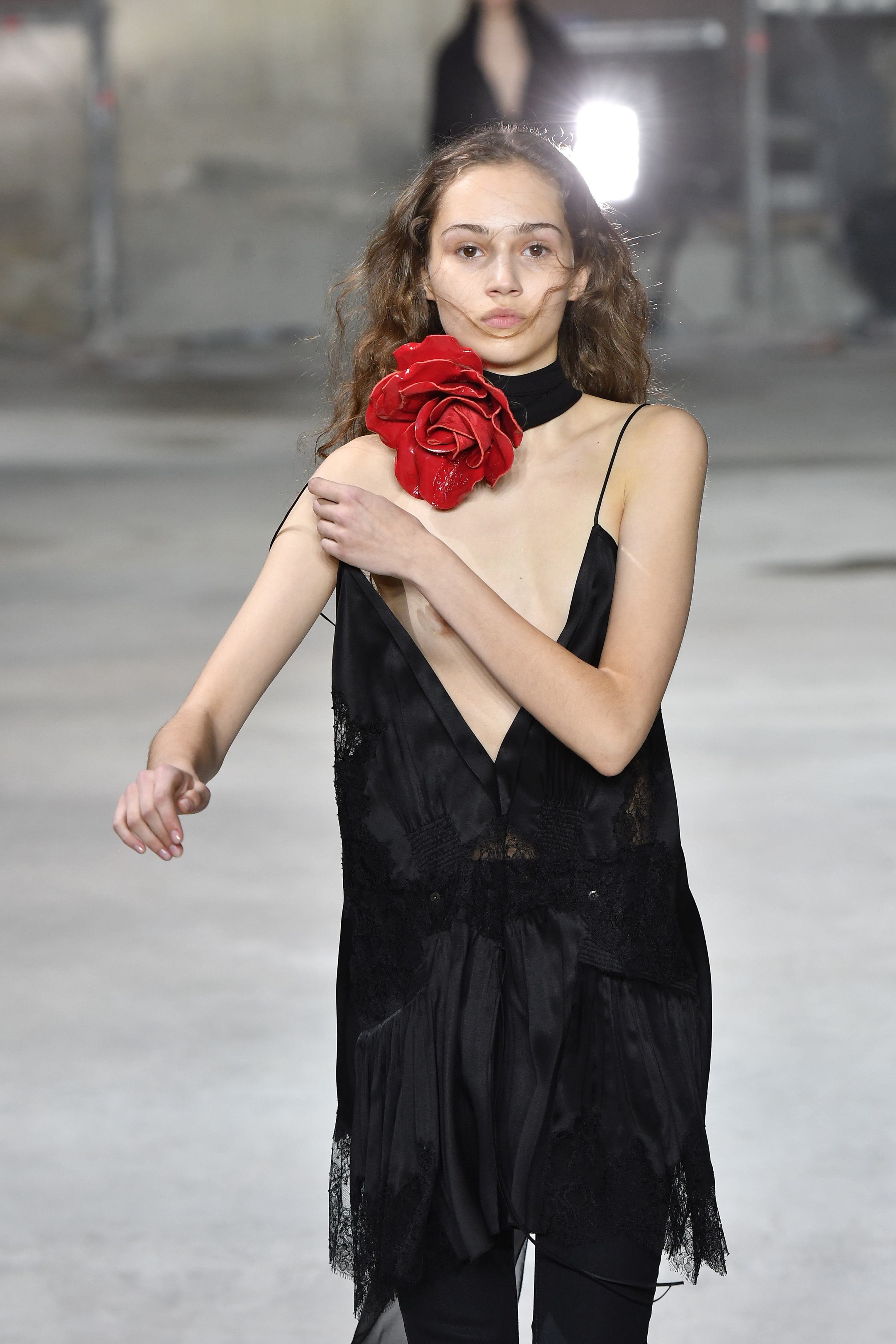 A defilat pe podium și fără să vrea, sub privirile tuturor, și-a descoperit bustul! În timpul prezentării Saint-Laurent, un model a încercat să-și aranjeze bluza mult prea mare și s-a ales cu această imagine.