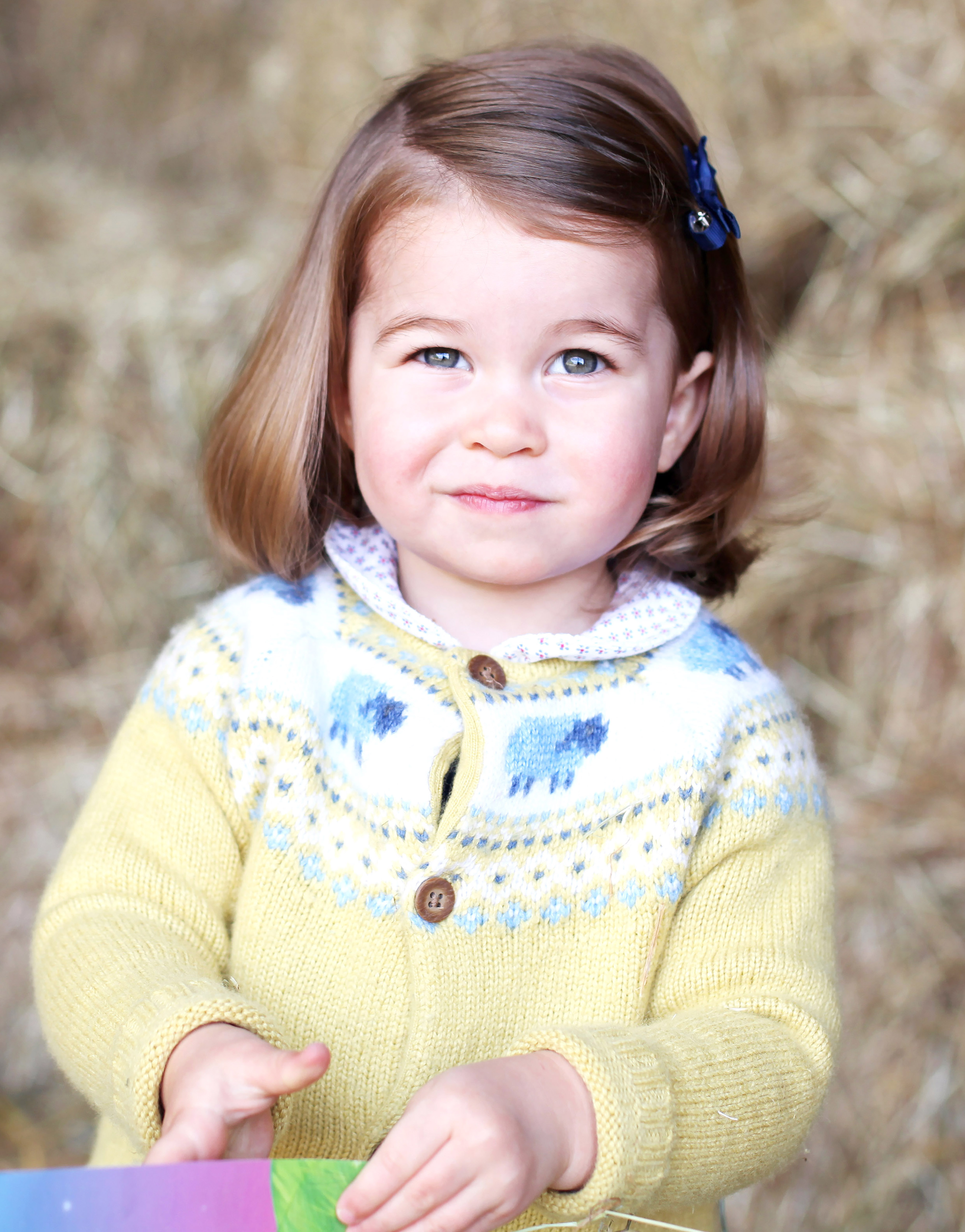 Imaginea o prezintă pe prinţesa Charlotte în grădina reşedinţei Anmer Hall, în timp ce poartă un pulover galben, decorat cu desene care reprezintă oi. Ea poartă în păr şi o agrafă albastră.