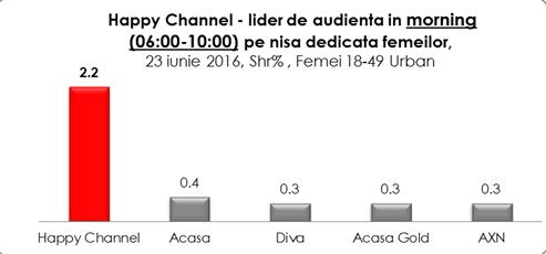 De remarcat că, în morning, principalul competitor are o cota de piaţă de cinci ori mai mică decât cea a Happy Channel, iar în Day Time, valoarea market share a Acasă TV este la jumătate comparativ cu Happy.