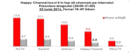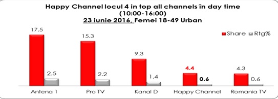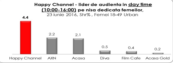 De asemenea, în Day Time, Happy Channel s-a clasat în top patru televiziuni, pe nişa femeilor cu vârste cuprinse între 18 – 49 de ani, având audienţe mai mari decât posturile de ştiri, dar şi alte televiziuni generaliste importante.
