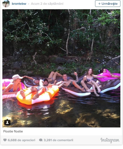 Bronte Blampied apare alături de Biber și un grup de prieteni petrecând în stil hawaian pe un râu, potrivit unei fotografii postate pe contul de Instagram al fotomodelului.