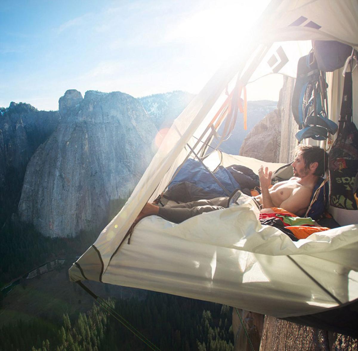 Kevin Jorgeson și Tommy Caldwell mănâncă, se relaxează și dorm în corturile suspendate pe peretele denumit ”Dawn Wall”. Chiar dacă nu au confortul de acasă, îi au aproape pe cei dragi, cu care țin legătura folosind platformele de socializare.