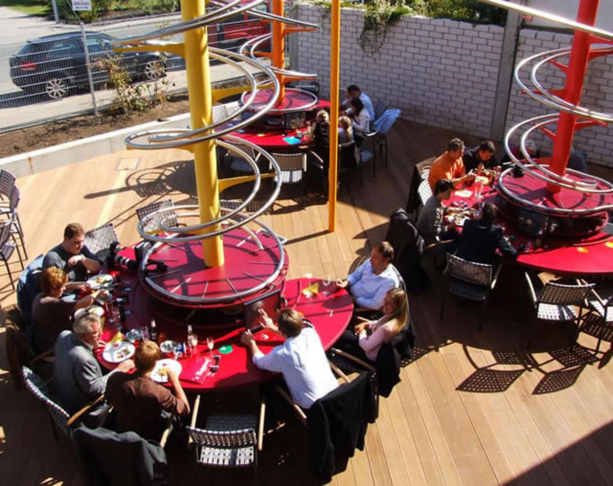 Fiecare client are la masa un touchscreen de unde poate selecta mancarea dorita si i se da un timp de asteptare exact. Dupa ce timpul s-a scurs, bauturile si mancarea coboara pe o scara spiralata, in fata clientului.