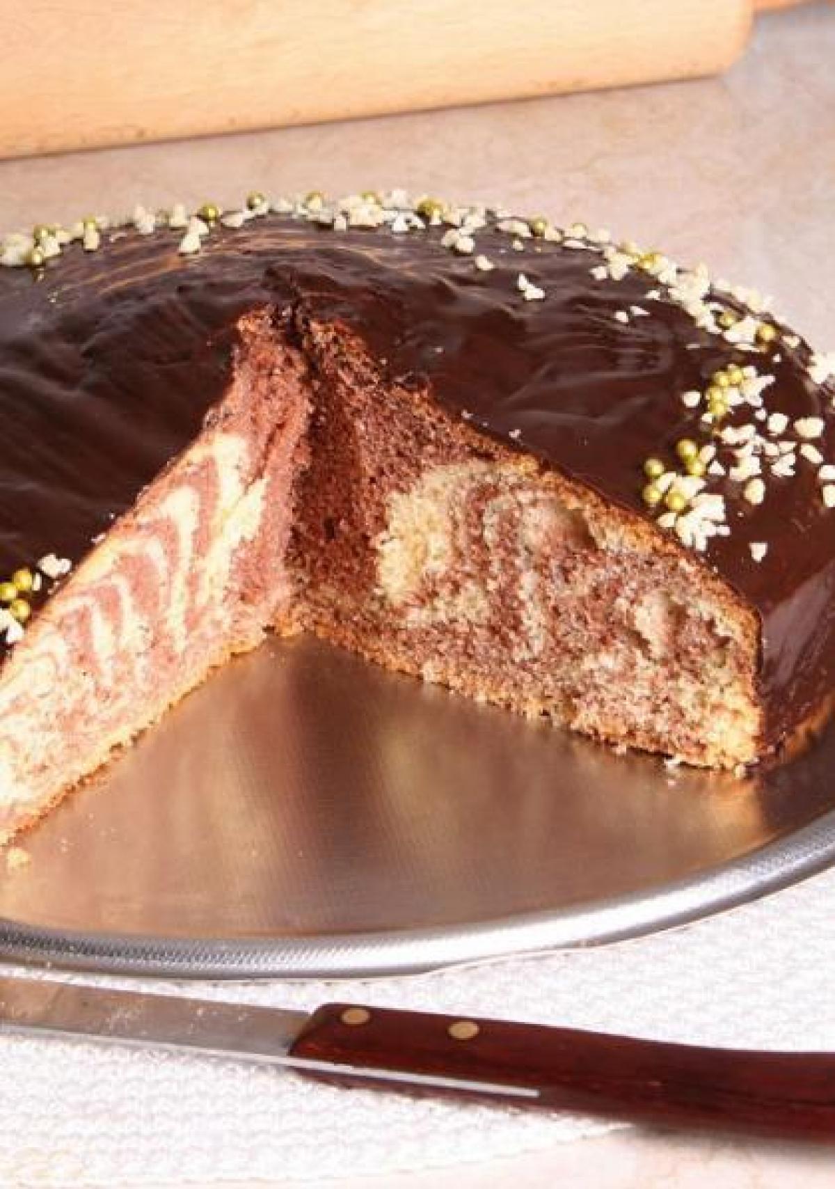 9. Se toarnă aluatul cu ajutorul poşurilor în vasul de gătit începând de la centru spre suprafaţa laterală în spirală. Se alternează straturile de aluat alb şi de aluat cu ciocolată.