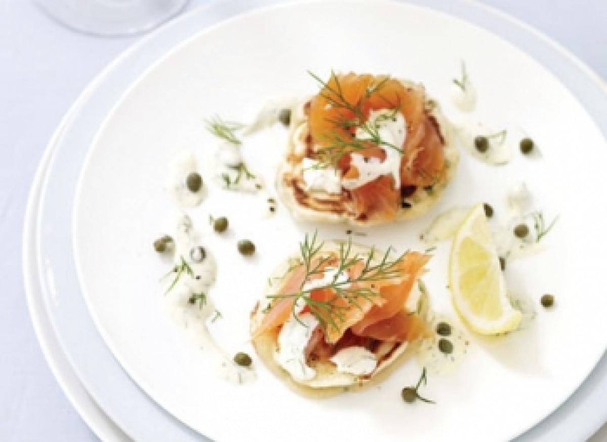 2. Pentru vinegreta, se amesteca crème fraiche cu zeama de lamaie, caperele si jumatate din cantitatea de marar (daca este prea gros, se mai adauga zeama de lamaie). Se asaza cate doua clatite pe fiecare farfurie, pe ele se asaza somon afumat, apoi se toarna vinegreta si se presara putin marar.