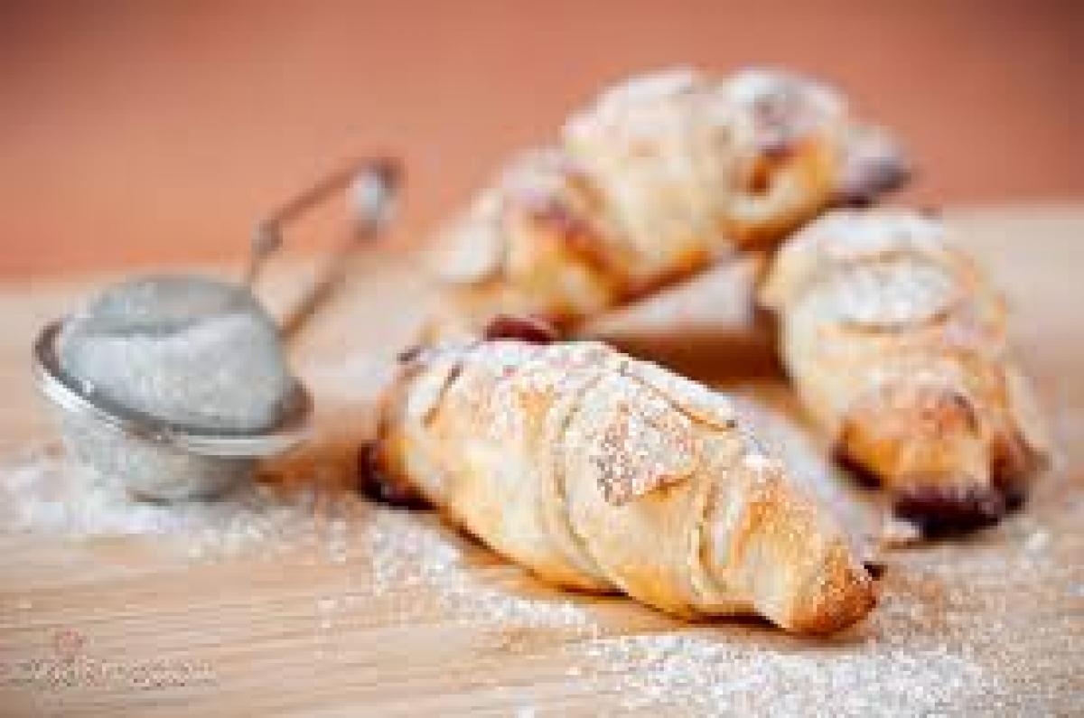 Se frământă, se întinde o foaie de cornulețe. Se taie bucățele și se fac cornulețe.