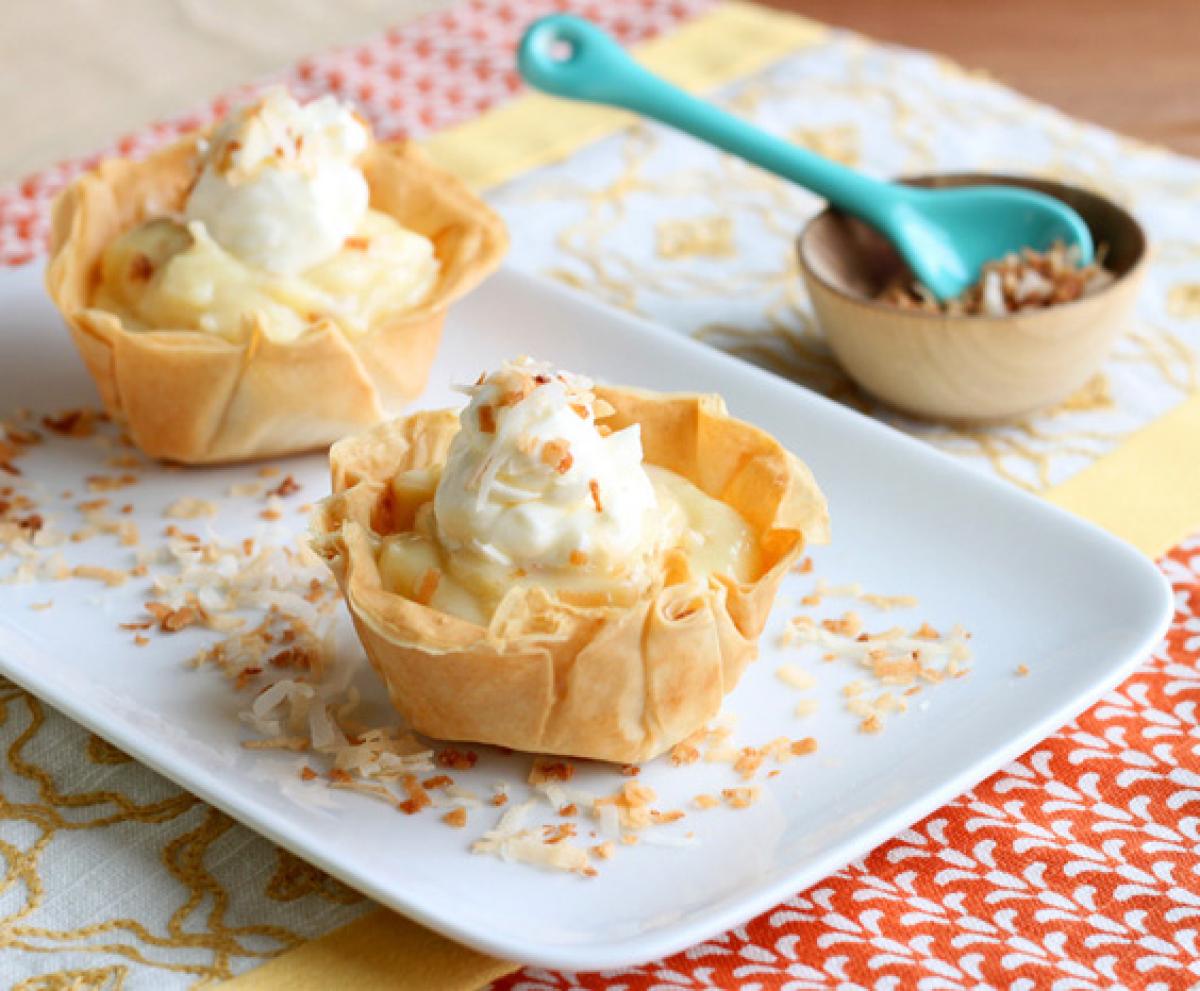 - Strecoara crema de cocos si adauga ¾ din frisca. Pune acest amestec in tarte. Presara peste fiecare cocos prajit. Da la rece pana la servire.