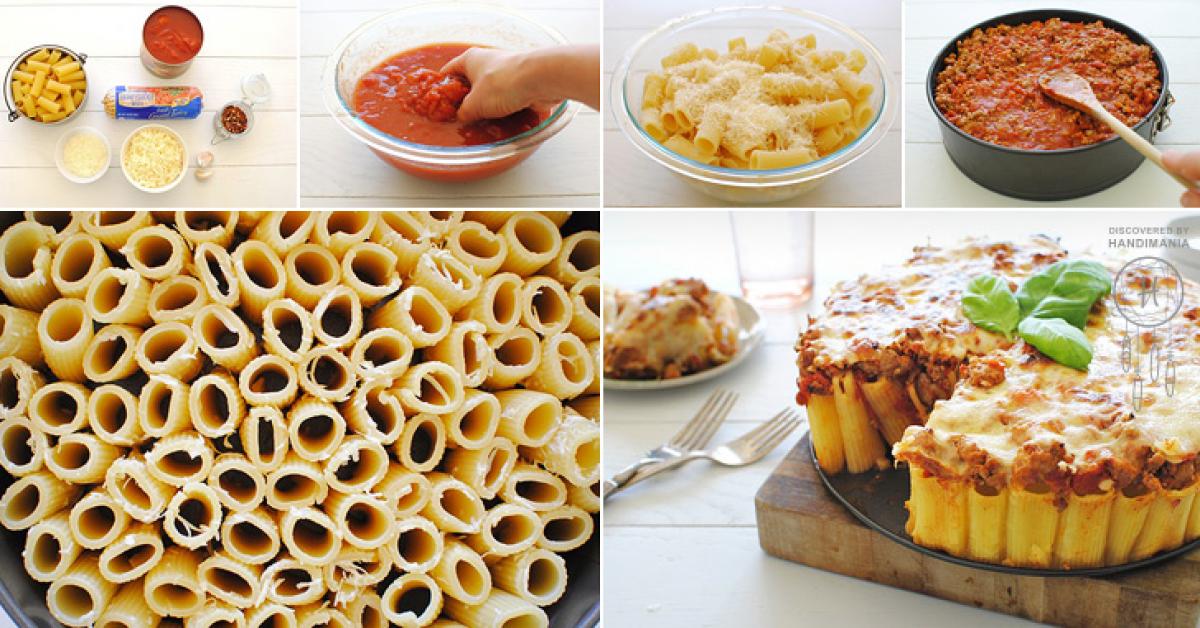 Toarna carnea cu rosii peste paste - in fiecare rigatoni trebuie sa intre compozitie.