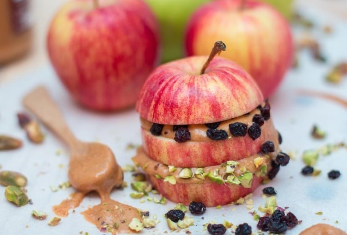 Se unge o parte cu unt de arahide, se pune fistic, cealaltă felie de măr și stafide, apoi partea de sus.