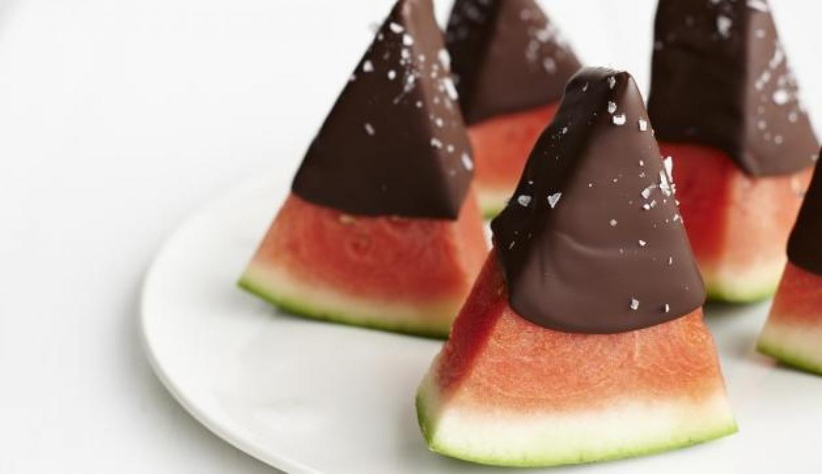 Înmoaie feliile de pepene în ciocolată.