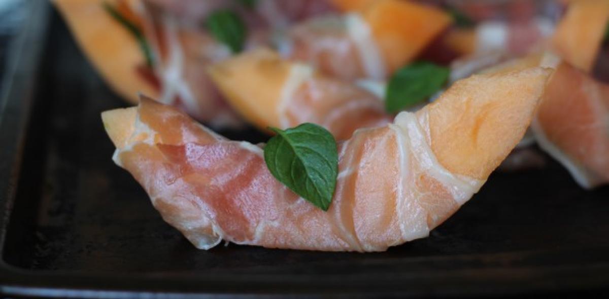 Se pune pepenele pe o farfurie, se presară frunze de mentă tocate. Se învelește fiecare bucată cu felii de prosciutto.