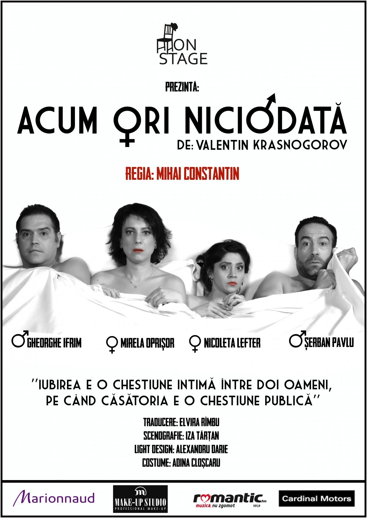 “Acum ori niciodată" de Valentin Krasnogorov. O comedie uşoară la prima vedere... 4 personaje, 2 cupluri şi o temă, pe cât de cunoscută şi “bătătorită” de toată lumea, în scris şi în viaţa reală, pe atât de specială ca abordare şi viziune: Căsătoria şi familia. În esenţă - o comedie amară. Conform statisticilor, în lumea de azi sunt mult mai multe divorţuri decât căsătorii fericite. Iar după un divorţ şi o altă căsătorie, de cele mai multe ori, nu vei deveni mai fericit. Cele patru personaje ale piesei sunt oameni obişnuiţi care se confruntă cu aceeaşi problemă. O piesă care cu siguranţă place, fie pentru că ne regăsim adesea într-o astfel de poveste, fie pentru dialogul extrem de antrenant în care e scris, fie pentru replicile savuroase care îţi rămân întipărite în memorie...
