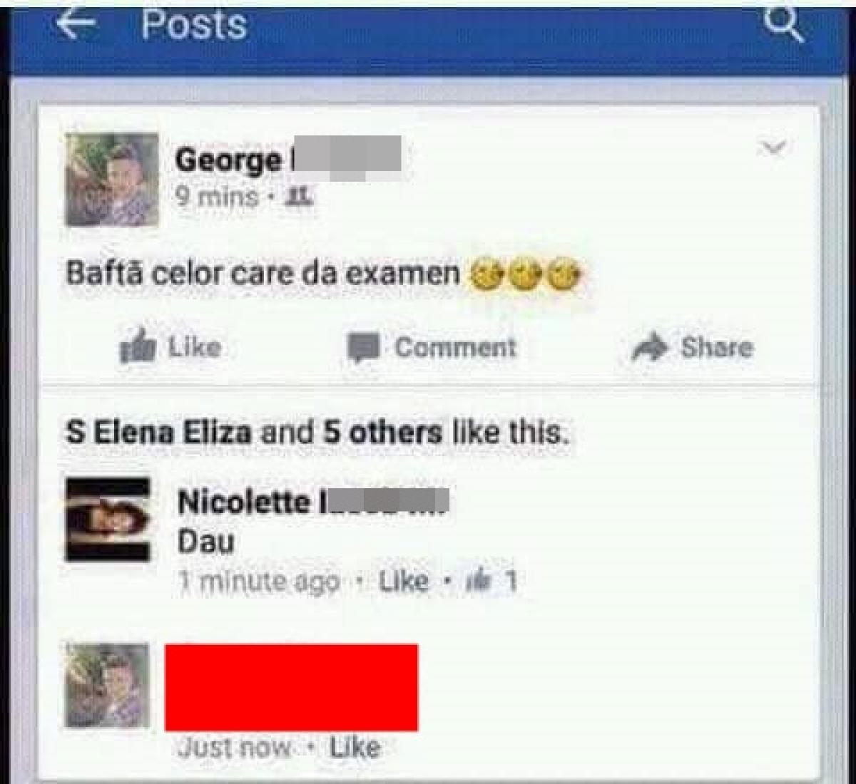 Băiatul le-a urat baftă celor care „dă” examenul maturității, moment în care o prietenă vigilentă l-a avertizat, printr-un comentariul, că nu a scris corect... Din păcate pentru el, băiatul nu a realizat greșeală uriașă pe care a făcut-o și a găsit de cuviință să o încurajeze și pe domnișoara care îi atrăsese atenția.
