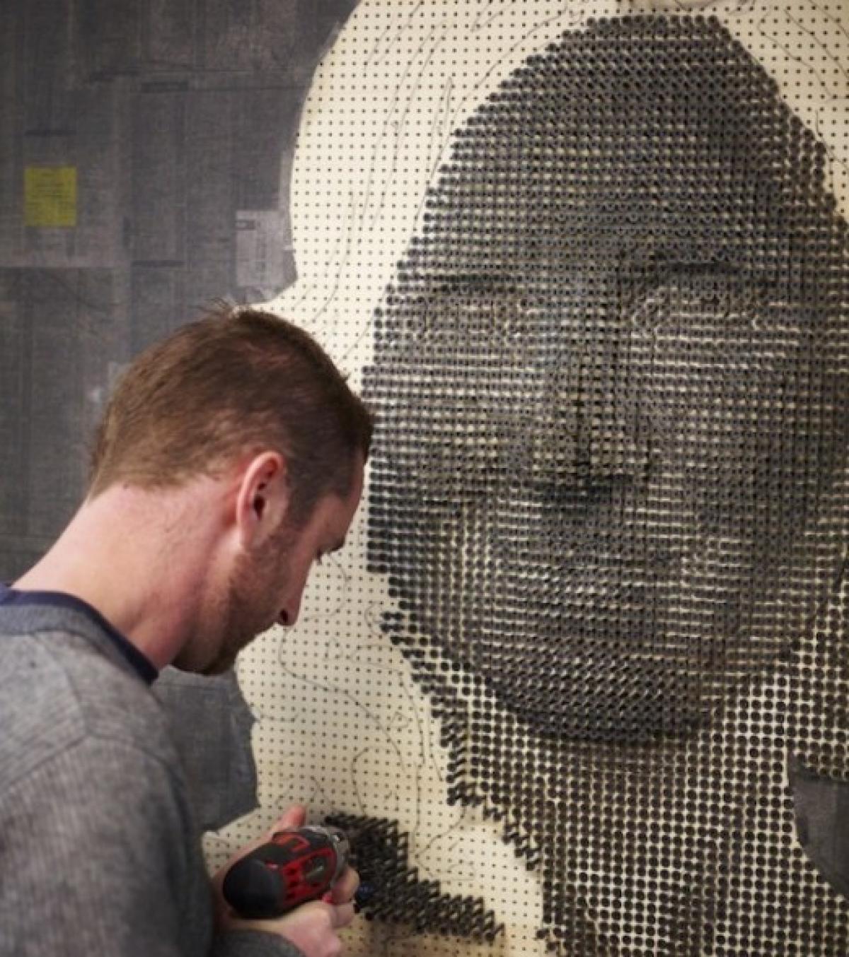 Gaurile pentru suruburi sunt facute dinainte, pentru a se asigura ca ele vor intra drept. Apoi incepe intregul proces, insa el nu se bazeaza pe nicio tehnica speciala, computerizata pentru a se ghida. Isi da seama de cat de adanc trebuie insurubate cuiele pe masura ce construieste portretul.