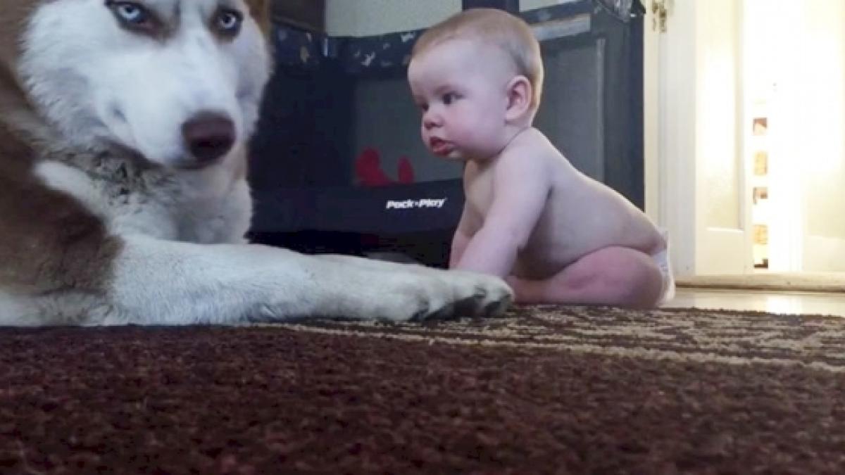 Bebelușul din materialul video de mai sus încearcă să îl convingă pe cățelul din rasa Husky să se joace cu el, iar reacția patrupedului este pur și simplu adorabilă.