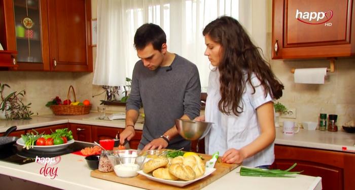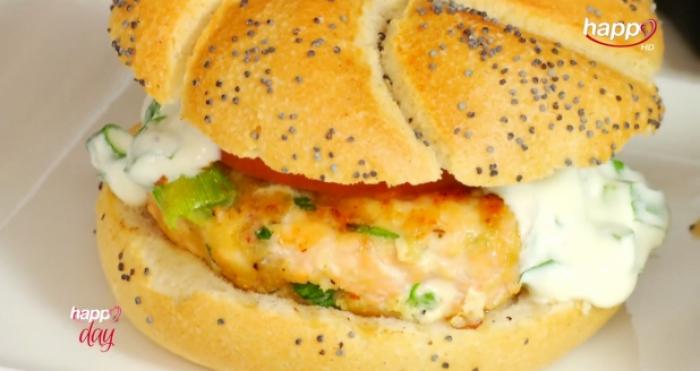 Burger sanatos de somon, cu verdeata si sos grecesc.