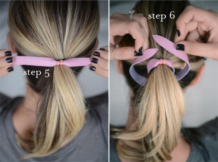 Strange-ti parul in coada, cu partea cauciucata sus, ca in imagine. Ea va fi acoperita de benzile de piele, cu un dublu nod, dupa ce le treci pe sub coada.