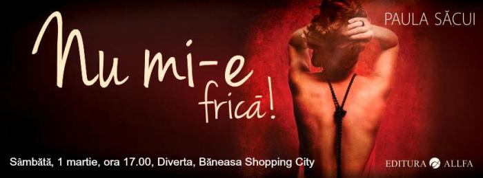 Diverta și Editura Allfa vă invită sâmbătă, 1 martie, de la ora 17.00, la o întâlnire cu Paula Săcui, autoarea romanului Nu mi-e frică. Evenimentul va avea loc în magazinul Diverta din Băneasa Shopping City, iar cititorii vor avea ocazia să o cunoască pe Paula – autoarea, dar și pe Lola, protagonista romanului care și-a epuizat primul tiraj în doar câteva săptămâni de la lansare. La finalul evenimentului, Paula Săcui va susține o sesiune de autografe.