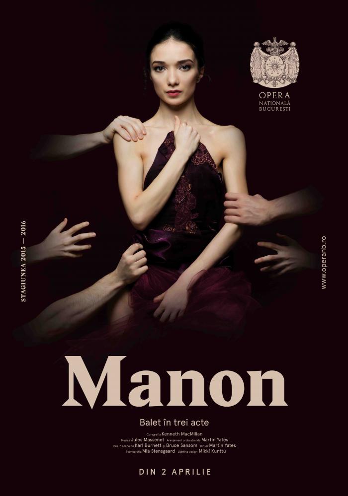 Sâmbătă, 2 aprilie, de la ora 19:00, la Opera Națională București are loc premiera baletului „Manon” - muzica de Jules Massenet, coregrafia de Kenneth MacMillan, cu un scenariu bazat pe romanul din 1731 al Abatelui Prévost.