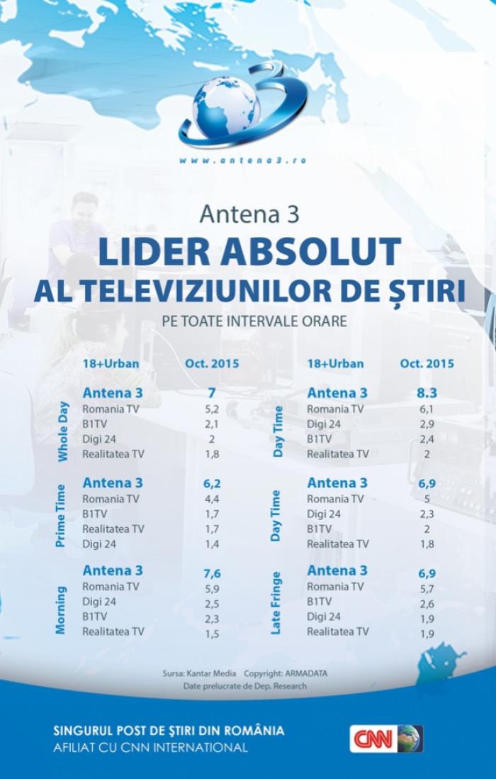 Antena 1, Antena 3 şi Antena Stars sunt în top zece televiziuni şi în luna octombrie. Trustul Intact are cele mai multe segmente de leadership la nivelul targetului urban. Audienţele Antenei 1 sunt în creştere în Prime-Time, comparativ cu aceeaşi luna a anului trecut.