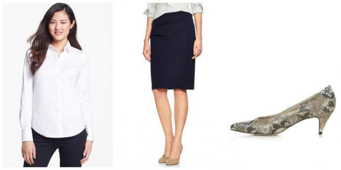 Halogen shirt, $58, nordstrom.com, Gap pencil skirt, $55, gap.com, Topshop heels, $95, topshop.com