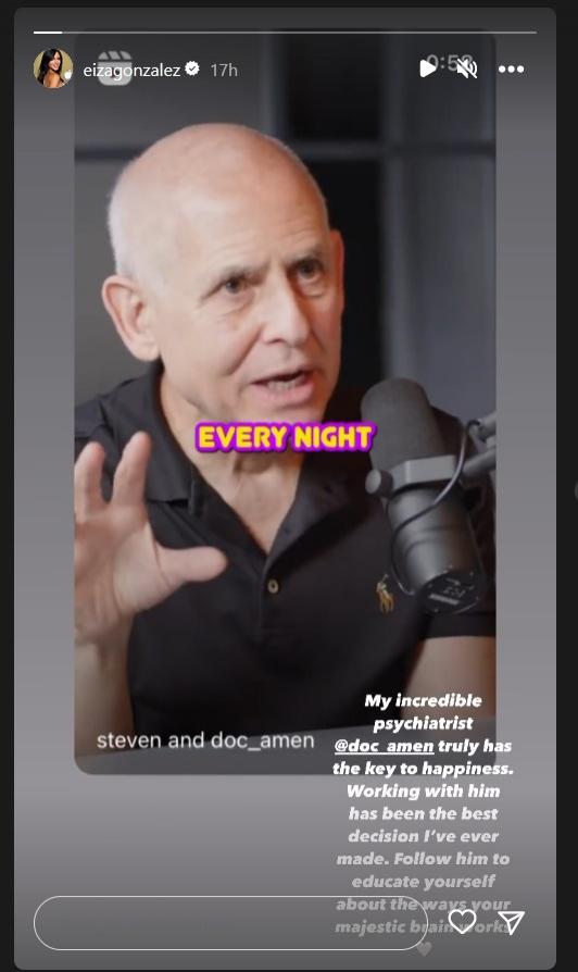 Eiza Gonzalez a distribuit pe rețelele sale de socializare un videoclip cu psihiatrul său care oferea un interviu în cadrul unui podcast. Acesta a scris un mesaj pe InstaStory prin care afirmă că a apelat la ajutorul unui specialist în situațiile delicate din viața sa.