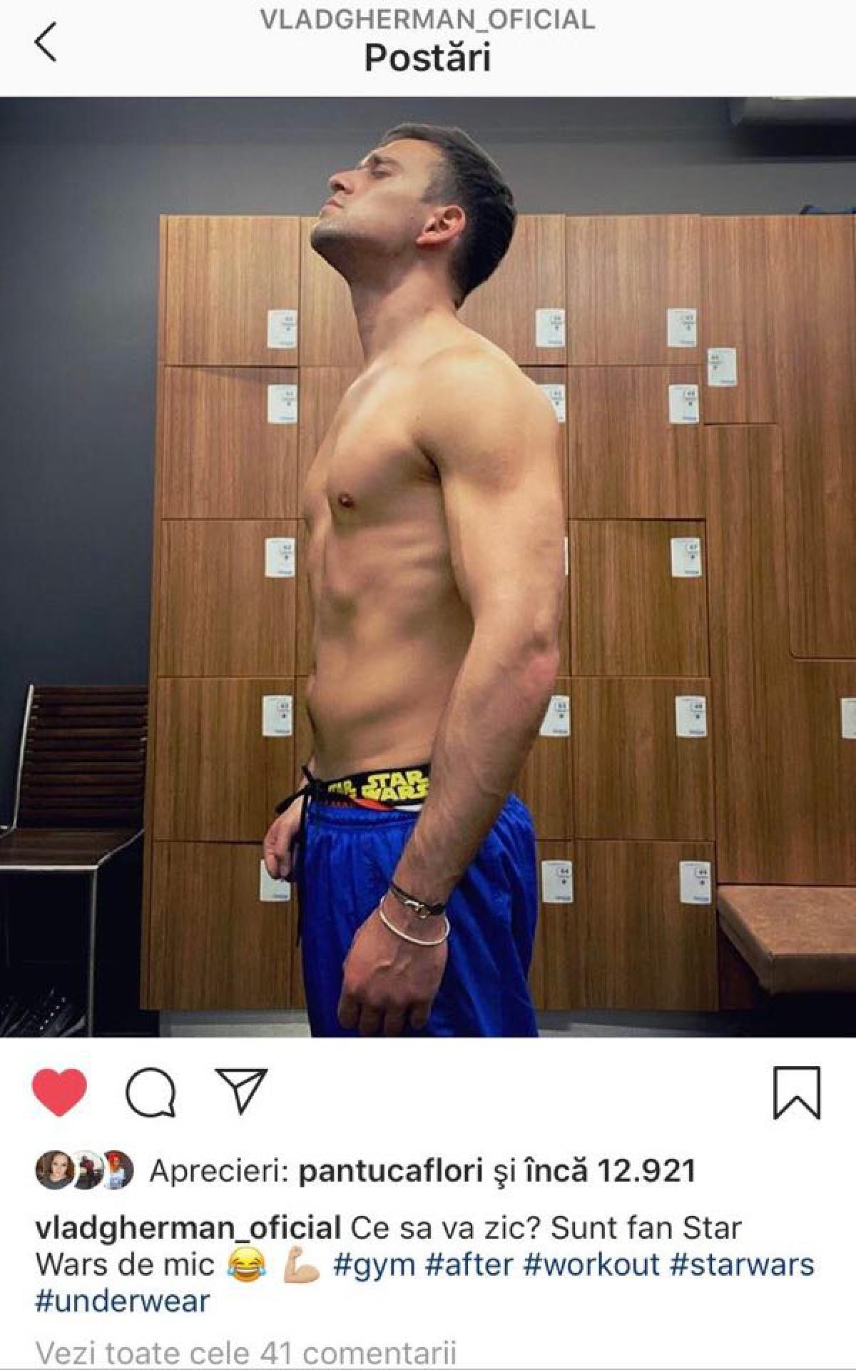 Într-o fotografie postată pe contul său de Instagram, acesta își etalează mușchii și pătrățelele.