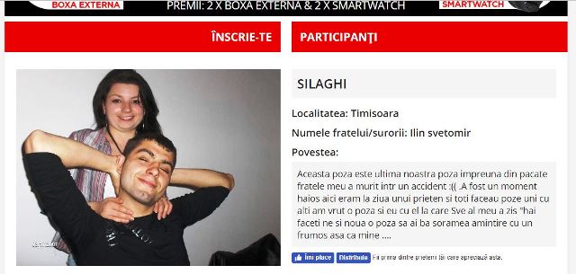”Aceasta este ultima noastră poză împreună. Din păcate, fratele meu a murit într-un accident. A fost un moment haios, pentru că aici eram la ziua unui prieten și făceam poze unii cu alții. Am vrut să fac și eu poze cu fratele meu, iar Sve al meu a zis ”Hai, faceți-ne și nouă o poză, să aibă și sora mea o amintire frumoasă cu mine”, este povestea trimisă de telespectatoarea Happy Channel.