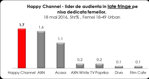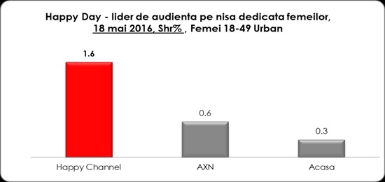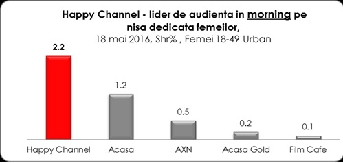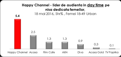 Postul de televiziune Happy Channel a fost miercuri, 18 mai, lider absolut de audienta pe targetul comercial femei 18-49, urban: in prima parte a zilei (morning time), in cursul diminetii, Happy Channel a ocupat locul intai, cu o medie a cotei de piata de 2,2%, in timp ce urmatorul post clasat, principalul competitor, a avut o medie de 1,2% cota de piata, pe acelasi target.