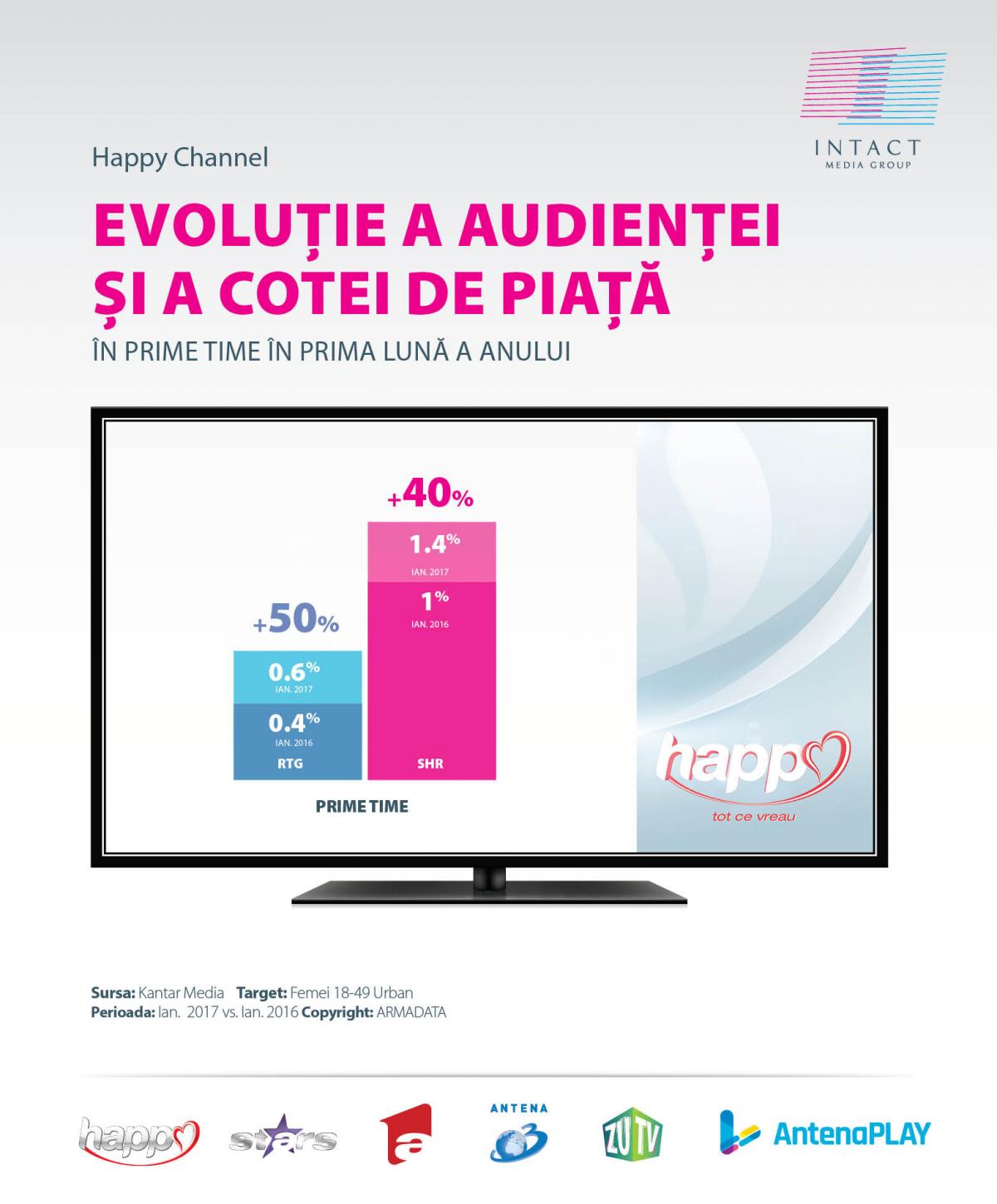 Happy Channel, postul dedicat femeilor curajoase, are creșteri ale audienței (+50%) și ale cotei de piață (+40%) în intervalul Prime Time, comparativ cu prima lună a anului trecut. Cele mai urmărite programe ale stației au fost “Elif”, “O poveste de iubire”, “Gossip Girl”, “Downton Abbey” și “Legea pământului”.