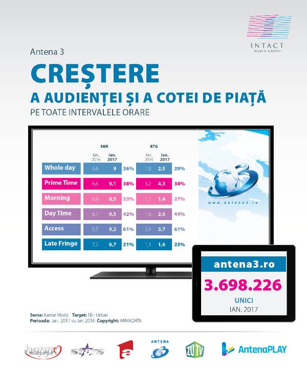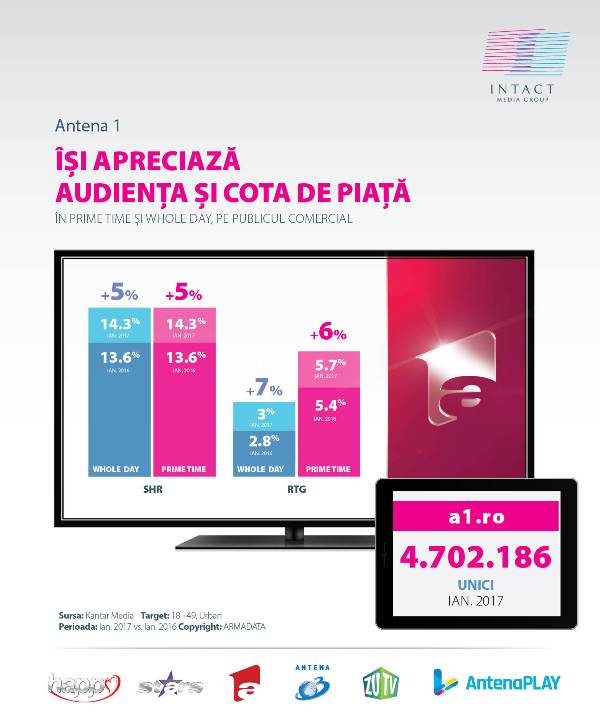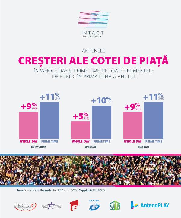 Ianuarie 2017 a adus diviziei TV Intact Media Group o evoluție a audienței pe intervale orare importante, acoperind toate segmentele de public măsurate oficial (18-49, urban și național), comparativ cu aceeași perioadă a anului trecut. Creșterile cotei de piață au vizat atât întreg Grupul, cât și fiecare dintre cele cinci stații TV din portofoliu.