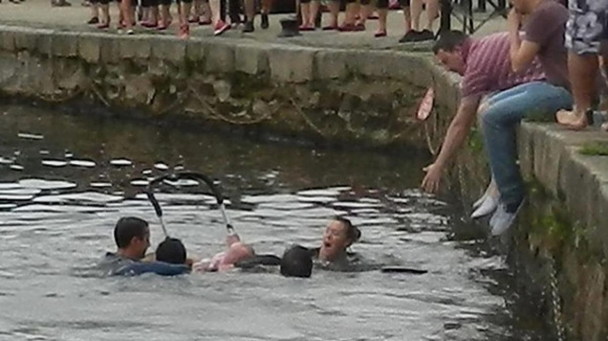 Fetița, în vârstă de un an, avea ochiii în lacrimi și era gata să fie îngițită de râu, însă mama sa și trecătorul au reușit să scoată căruciorul la suprafață, salvând viața micuței.