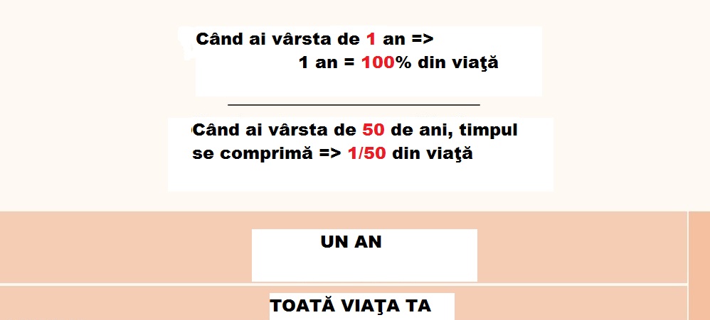 Simplificând schemele, reiese că: un copil de 10 ani resimte trecerea unui an ca pe 1/10 din toată viaţa sa, o persoana de 50 de ani resimte ca pe 1/50 din toată viaţa sa. Când copilul are doar o lună de viaţă, atunci, pentru el, o săptămămână echivalează cu un sfert din toată viaţa sa.