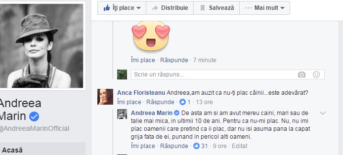 Un comentariu însă, din noianul de aprecieri şi elogii, a făcut brusc notă discordantă "Andreea, am auzit că nu-ţi plac câinii....este adevărat?"