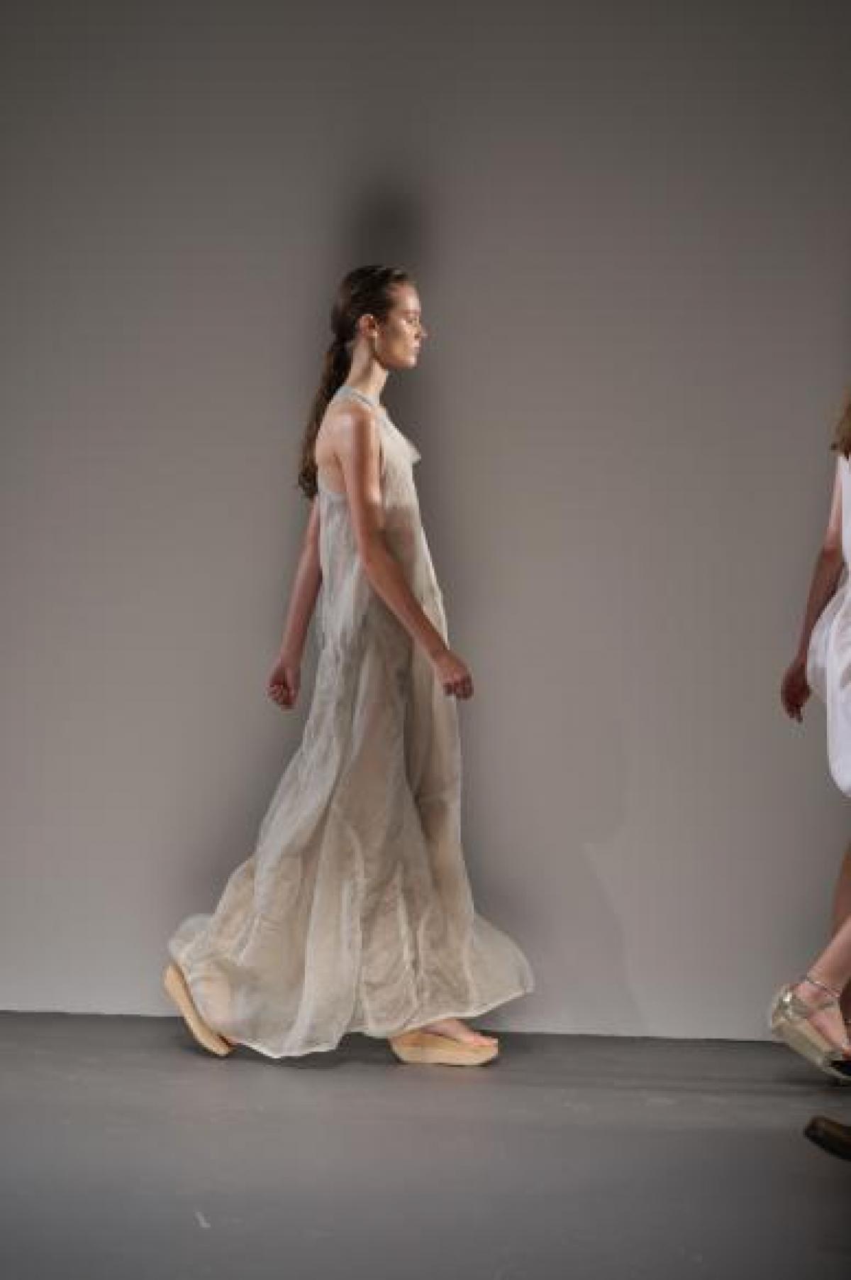 "Am pornit de la alb, apoi, am trecut la nuantele scoicilor si ale pietrelor. Sunt aproape ca niste obiecte pe care le gasesti pe plaja. Am creat textile foarte interesante, am combinat excelent materialele. Am conferit noi forme texturilor, am folosit matasuri si bumbac cu doua fete pentru un aspect al colectiei elastic si flexibil", a spus Costa pentru Videofashion.
