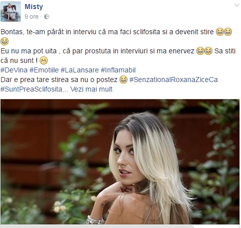 Cu toate acestea, blonda a făcut o afirmaţie cel puţin halucinantă pe pagina de Facebook, în care se descrie pe sine cu ochi mai mult critici: " Bontas,(n.red. o prietenă) te-am pârât in interviu că mă faci sclifosita şi a devenit stire