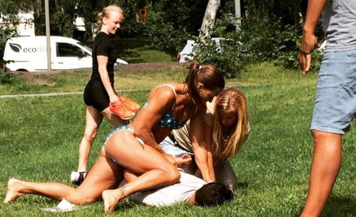 Imediat, poliţista aflătă în afara serviciului, îmbrăcată într-un costum de baie minuscul, l-a alergat, până ce a reuşit să-l prindă. Aceasta, împreună cu încă o prietenă, l-a pus la pământ şi l-au predat mai departe!