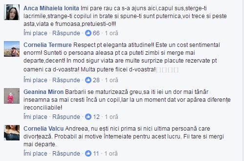 Internauţii s-au arătat solidari cu Zâna şi îi doresc să treacă cât mai repede peste acest impas. Totuşi, unii nostalgici văd în această despărţire o potenţială apropiere de tatăl fiicei sale, Violeta. Am selectat pentru voi doar câteva dintre sutele de mesaje care au apărut pe pagina de Facebook a Andreei Marin, la scurt timp de la anunţ.
