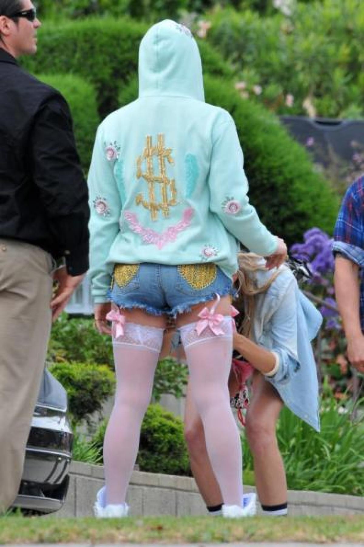Vedeta a iesit pe strada intr-o tinuta asamblata parca de un copil pasionat de r'n'b: bustiera roz, camasa in carouri bleu si alb, un hanorac brodat cu un dolar, sort din denim cu inimi aurii, jartiere albe cu funde si tenisi albi cu platforma, accesorizate cu lanturi aurii, cercei toarta in forma de inima, ochelari de soare supradimensionati, bratari si inele enorme.