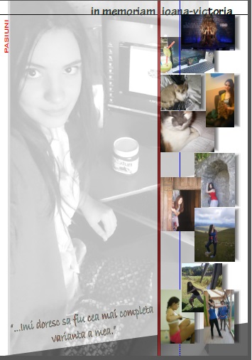Sunt planșe care suprind cele mai frumoase moment din cei 18 ani trăiți de Ioana-Victoria: Școala, Desen și Pictură, Design Vestimentar, Student Arhitect în Devenire, Fotografie, Sentimente, Joaca, Artista, Origami, Pasiuni, Muzică.