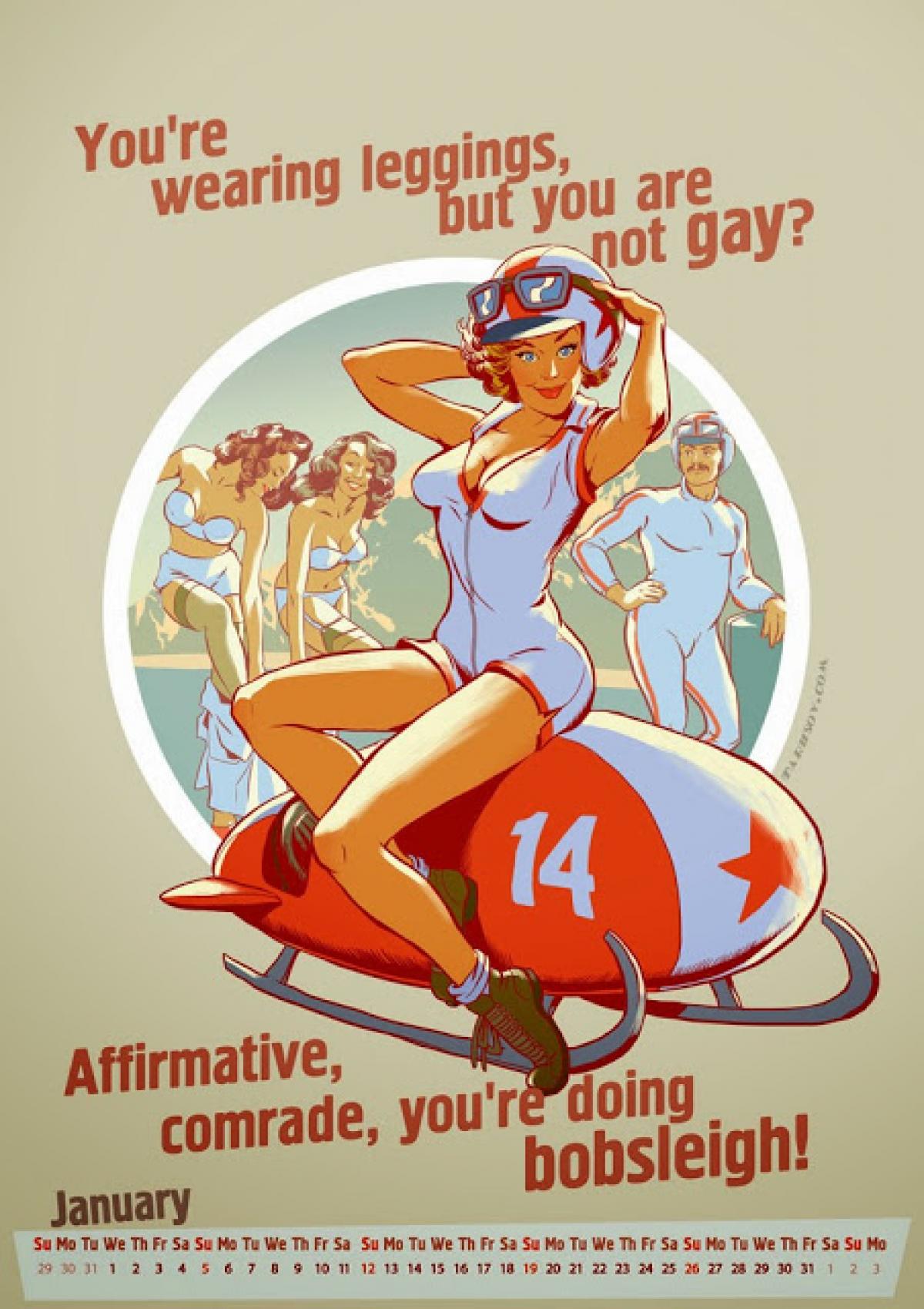 Andrew Tarusov a pus cap la cap ilustrații cu aer vintage pentru un calendar dedicat Jocurilor Olimpice de la Soci. Modelele apar în costume de sport provocatoare purtând accesorii esențiale pentru snowboarding, ski și hochei. Fiecare fată are propriul ei slogan atrăgător.