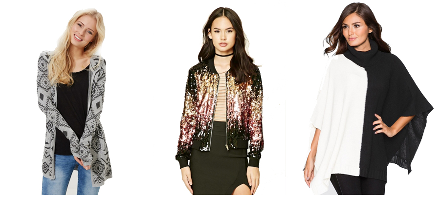 Cardiganul cu model etnic (69 lei), jacheta cu aplicații și paiete (294 lei) și poncho-ul alb-negru (79,90 lei) sunt trei obiecte vestimentare foarte versatile, care nu ar trebui să lipsească din dulapul tău în anotimpul rece.