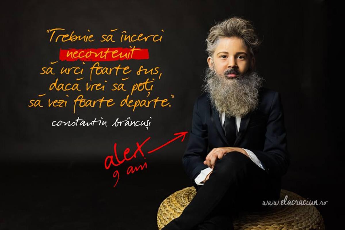 O campanie a cărei prima menire este conştientizarea, #Moştenirea îi are, totuşi, protagonişti pe copii, iar acţiunea capătă, astfel, o dimensiune cât se poate de veselă. Aşadar, timp de o săptămână, pe blogul Elei, cat şi pe pagina sa de Facebook, câte un copil va da viaţă unei personalităţi reprezentative a patrimoniului roman si universal. Alex are nouă ani şi este băieţelul care dă startul transformărilor inedite, intrupandu-l excelent pe sculptorul Constantin Brâncuşi.