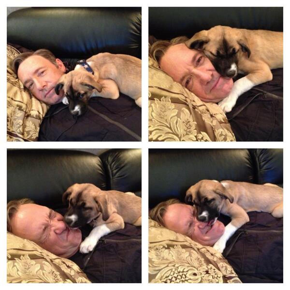 Spacey a postat pe Twitter mai multe fotografii adorabile cu el si catelusul adoptat, adaugand ca "misterul a fost rezolvat. Noul membru al familiei. Numele ei este Boston, in onoarea orasului".