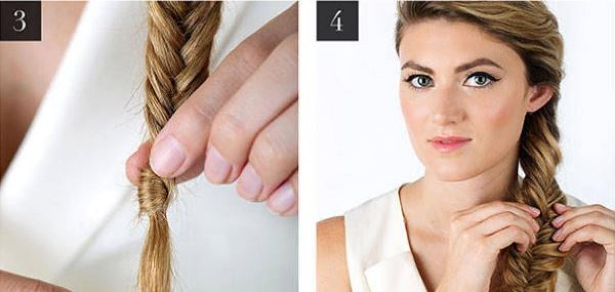 1. Fă cărare pe o parte și pregătește părul cu șampon uscat. Strânge partea cu mai mult păr pe o parte și începe să împletești, ducând primele șuvițe în spate. Ia suvițe de păr din ambele părți ale capului rotindu-le spre spate. Odată ce tot părul tău se află pe o singură parte începe să îți faci o coadă fishtail, separând părul în două secțiuni. Prinde totul cu un elastic și lasă-l în jos, ca în prima imagine.