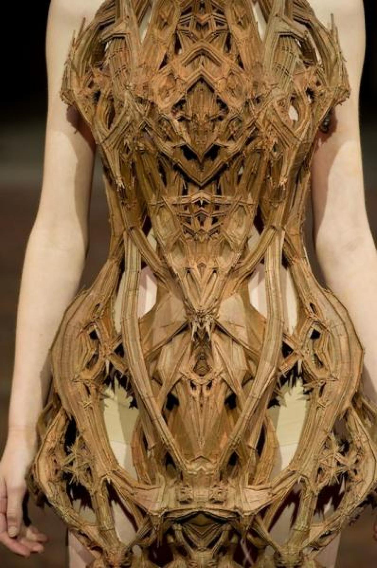 A ajuns virala pe site-urile care pun accent pe mesajele vizuale. Rochia ce pare sculptata din lemn, cu detalii deosebite, a incantat fashionistele si a intrigat designerii. Creatia ii apartine designerului Iris van Herpen.