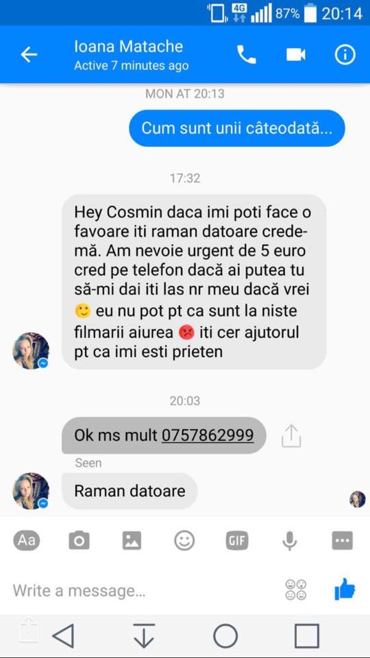 "Încă există acest cont fals?Oana nu are facebook!!!!!!!Acest individ cere bani oamenilor, în numele surorii mele.E incredibil,dar adevărat!