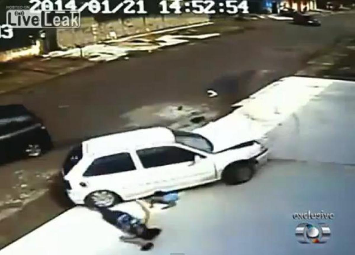 Scenă şocantă pe o stradă din Brazilia, în centrul oraşului Anápolis. O femeie şi nepotul ei au scăpat miraculos după ce o maşină, implicată într-o coliziune cu un alt autoturism, a trecut practic peste cei doi.