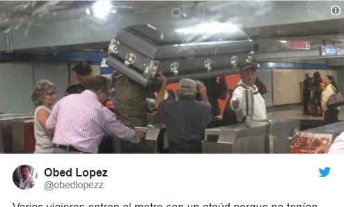 Cei care îl purtau pe umeri se chinuiau să treacă cu bine de bara de la metrou, atenți ca nu cumva sicriul sau... ”pasagerul” din el să sufere vreo zgârietură.