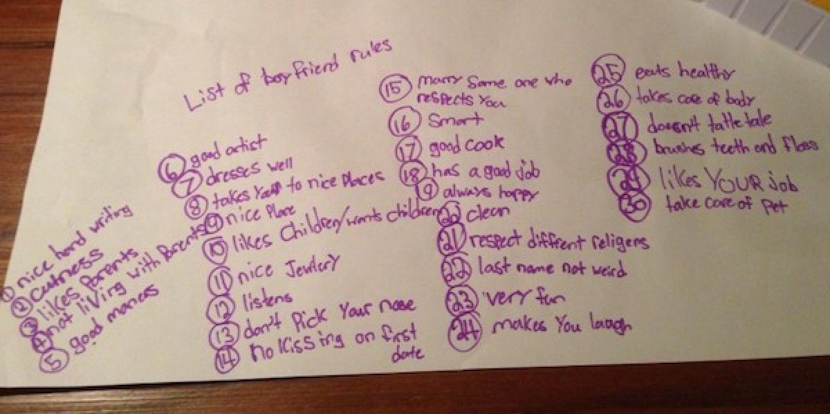Blaire, în vârstă de 6 ani și Brooke, de 9 ani, s-au decis ce reguli ar trebui să respecte viitorul lor iubit. Astfel, cele două au întocmit o listă cu 30 de caracteristici: